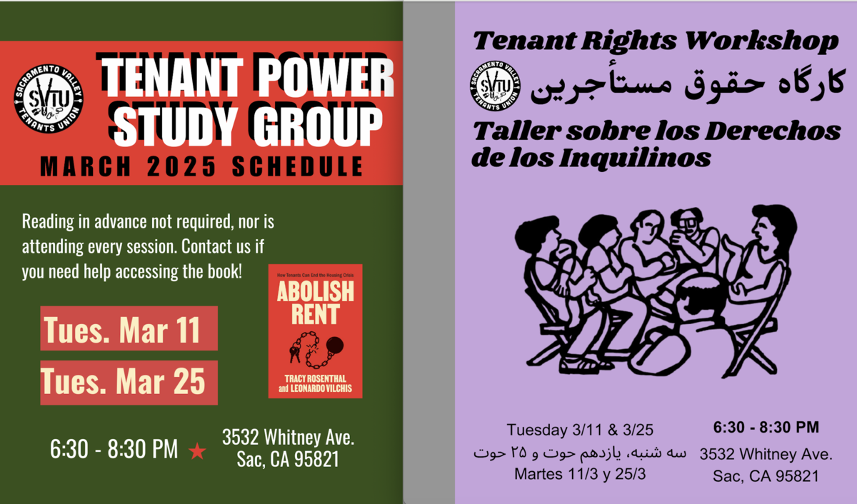 Happening concurrently with our Know Your Rights workshops is our Tenant Power Study Group. Right now we are reading the great book "Abolish Rent" by Leonardo Vilchis and Tracy Rosenthal of the LA Tenants Union. We're learning alot! All are welcome; no need to read in advance