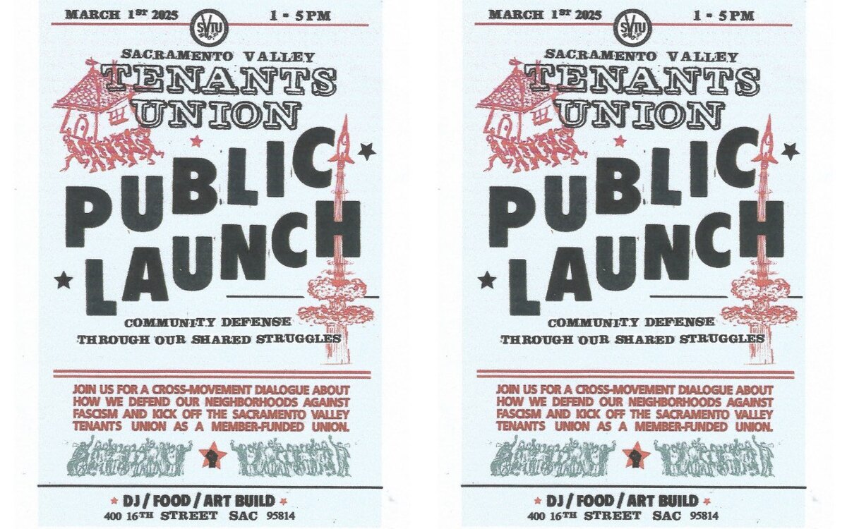 Join the Sacramento Valley Tenants Union as we celebrate the public launch of our member-funded union with music, food, art, and a cross-movement discussion about community defense. SVTU will facilitate a conversation between local organizations engaged in community defense against the fascist onslaught. We’ll exchange ideas and plant seeds for how to defend our most vulnerable neighbors, including immigrants, the unhoused, and our trans siblings. Participating organizations include Sac Punks with Lunch, NorCal Resist, a trans/queer defense affinity group and more to be announced in the coming days! We’ll explore how our movements intersect, emphasizing base building as the key strategy to tackling the housing and tenant crisis devastating our community.